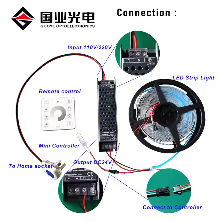 체이스 효과 라이트 스트립의 입력 끝을 컨트롤러의 신호 출력 끝에 연결하십시오. 스트립과 컨트롤러 사이의 플러그인 연결은 일반적으로 LED 스트립과 컨트롤러가 단단히 연결되고 신호 전송이 안정적인지 확인하는 데 사용됩니다.